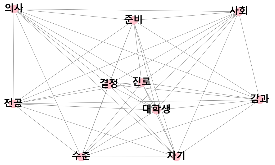 워드클라우드에서 확인했던 것과 동일하게 “진로”, "결정", "대학생" 과 같은 핵심 단어들이 중심에 위치하면서 다른 단어들과 긴밀하게 연결된 모습을 확인할 수 있습니다. 또한 "의사", "전공", "준비", "사회", "자기" 등의 단어 역시 진로결정과 밀접하게 연관되어 있음을 보여주고 있습니다.