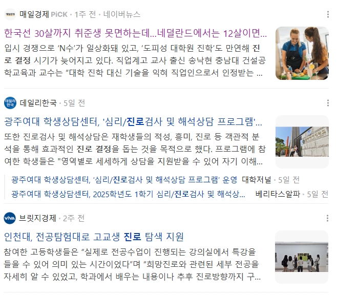 사진 속 기사들을 종합해 보면, 진로 교육의 필요성과 조기화가 중요한 화두로 떠오르고 있습니다.