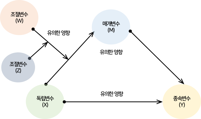 오늘 소개해 드린 Model 11은 삼원 상호작용이 포함된 조절된 매개모형으로, 독립변수(X)가 매개변수(M)에 미치는 영향이 두 조절변수(W와 Z)에 의해 복합적으로 조절되는 구조였습니다.