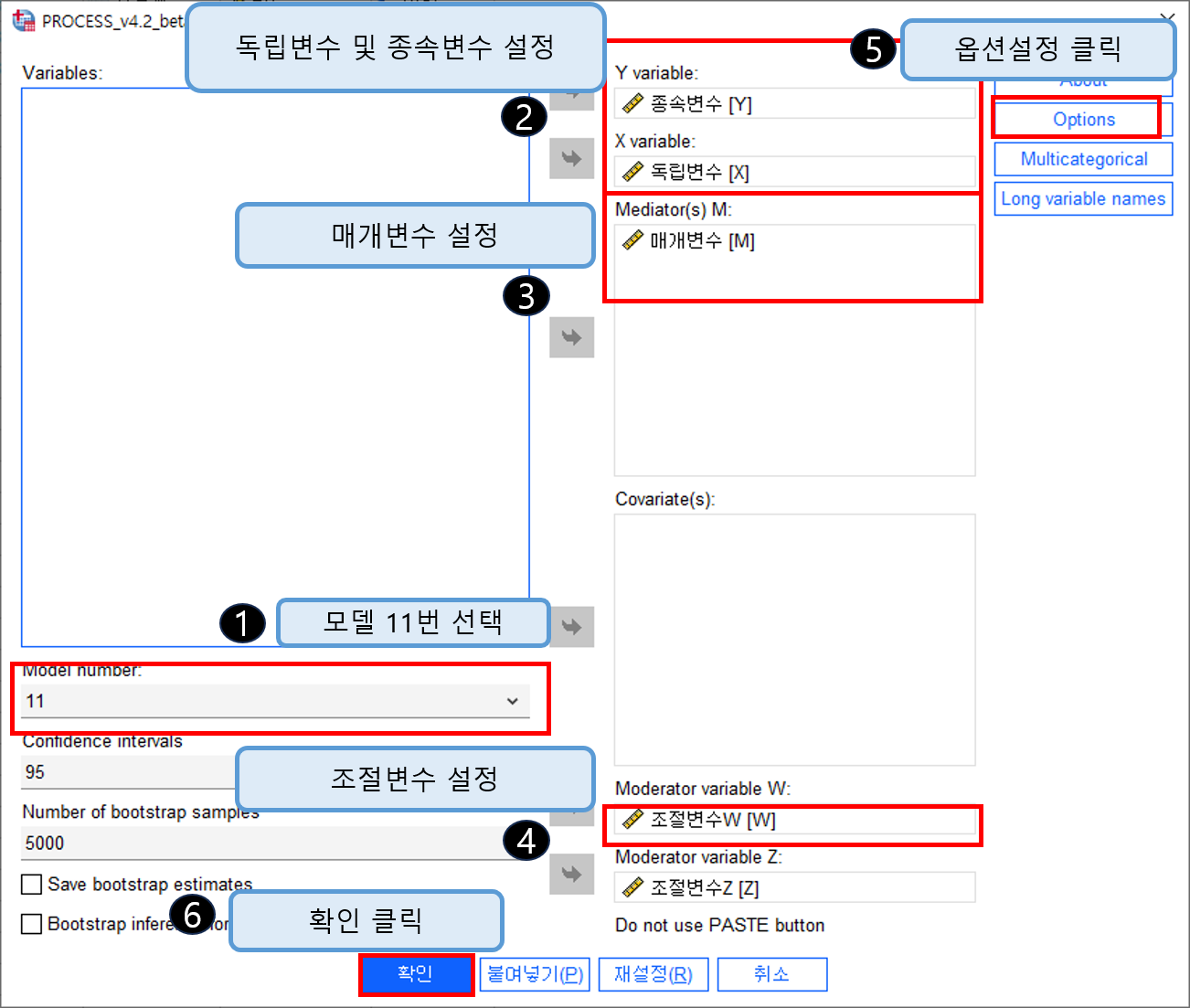 첫 번째로 모델 넘버(Model number)를 11로 설정합니다. 다음으로 독립변수, 종속변수, 매개변수, 조절변수를 차례대로 투입하면 모델 설정은 끝이에요! 다음으로 매개효과에 필요한 옵션을 선택한 후, 확인을 클릭하면 됩니다!