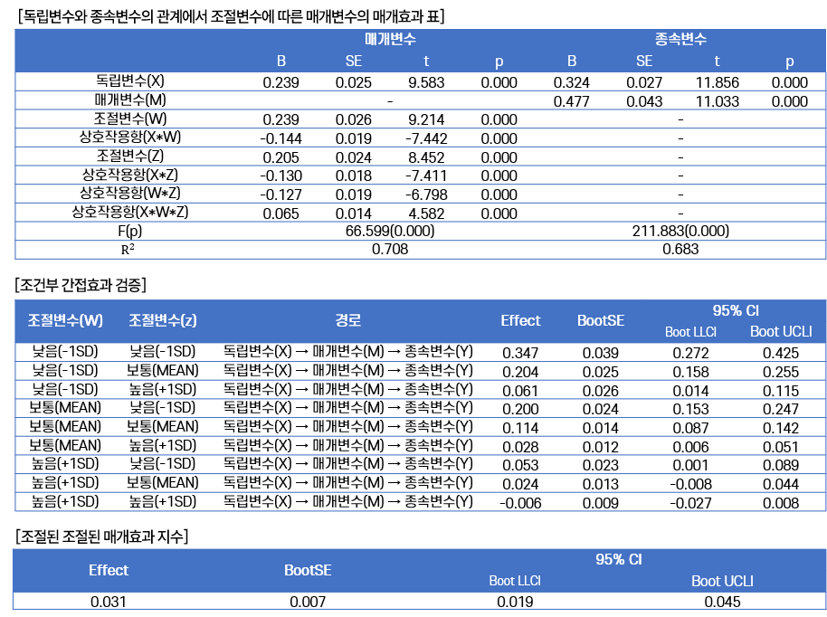 마지막으로, 조절된 조절된 매개효과의 지수(Index of Moderated Moderated Mediation)는 0.031로, 신뢰구간(LLCI = 0.019, ULCI = 0.045)이 0을 포함하지 않아 통계적으로 유의하였습니다. 따라서 본 연구 모형에서는 조절된 매개효과가 존재한다고 해석할 수 있어요.