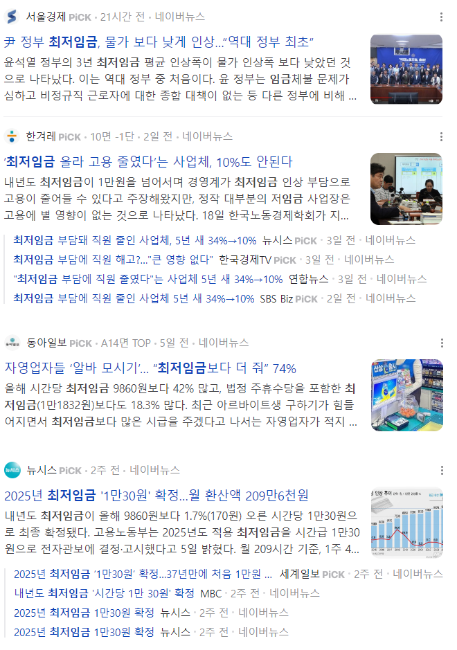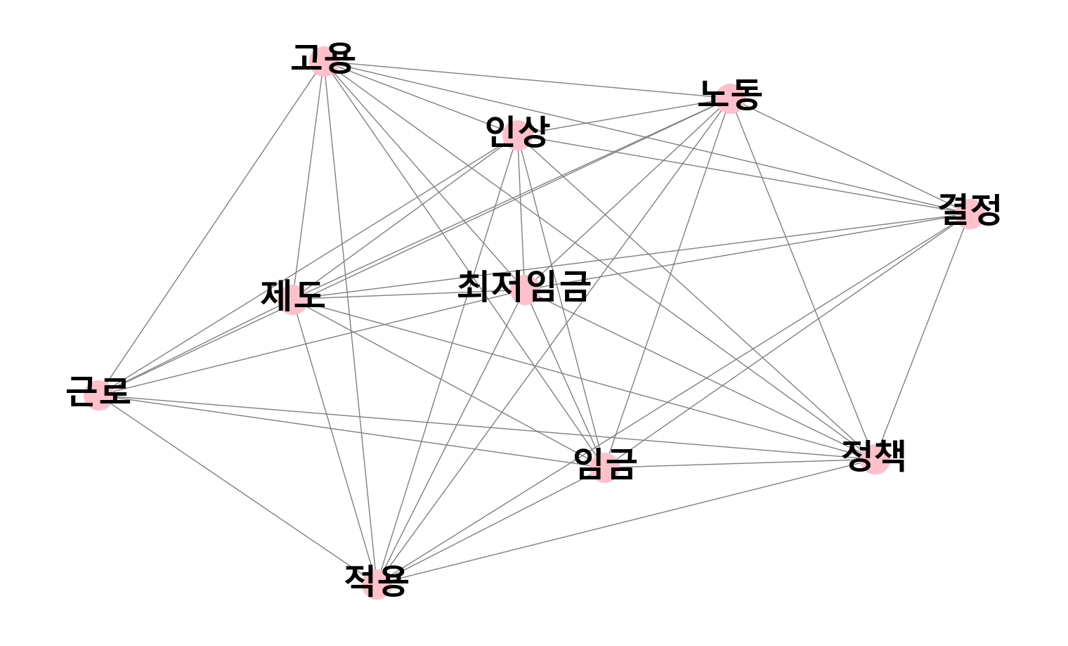다음은 네트워크 분석입니다.🔎 언급 빈도가 높은 상위 10개의 단어를 추출하여 네트워크 분석을 진행했어요. 이는 워드클라우드에서 확인된 키워드들의 상호 관계를 더 자세히 살펴볼 수 있답니다! 분석 결과, “인상“, ”임금“, ”제도“가 최저임금과 가장 가까이 위치하고 있네요. 아무래도 최저임금제도 및 최저임금의 인상이 국민들에게 직접적으로 영향을 미치기 때문에 연구가 더욱 많이 진행된 것 같습니다!