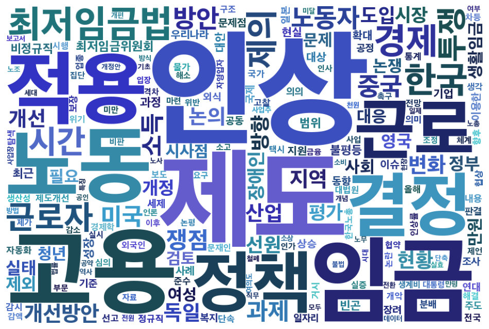 또한 “고용”, “임금”, “노동” 키워드의 빈도가 높은 것을 통해 최저임금이 노동시장과 밀접하게 연관되어 있다는 점을 알 수 있어요. 그리고 “적용”, “결정” 키워드를 통해서는 최저임금이 결정되는 과정과 그 적용에 대한 연구도 많이 진행되었다는 것을 알 수 있답니다. 이를 통해 최저임금이 사회 전반에 걸쳐 매우 큰 영향을 미친다는 것을 알 수 있어요! 😊